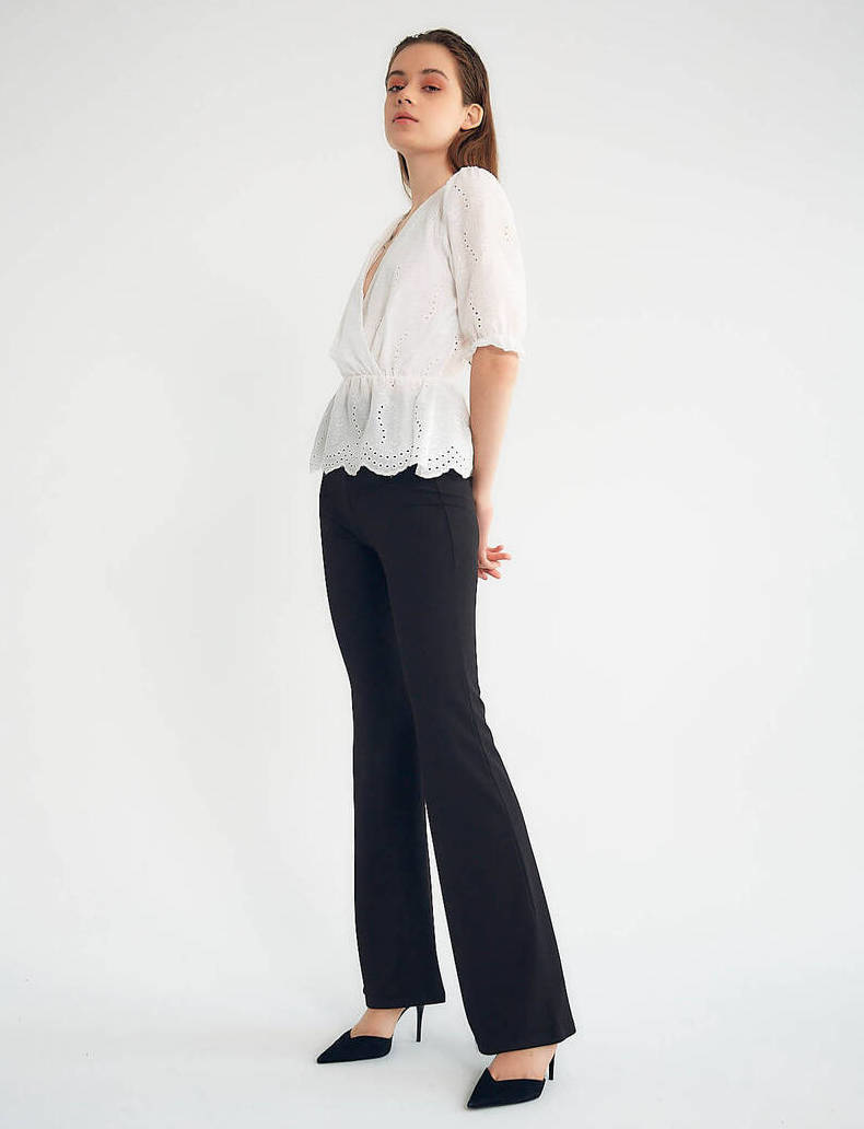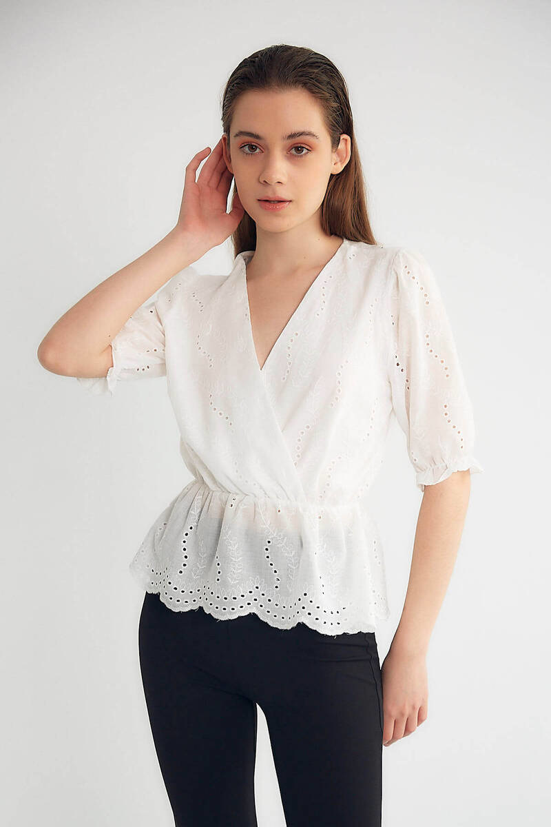 Es hat kurze Ärmel und einen V-Ausschnitt