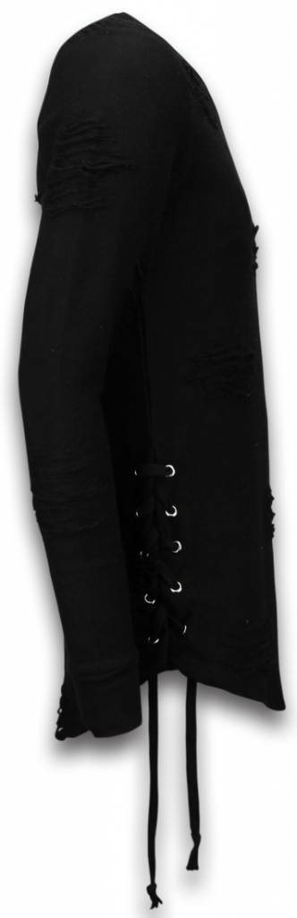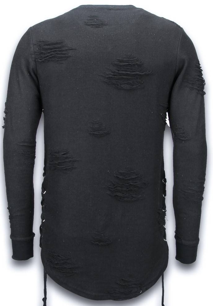 Destroyed Look Pullover - Side Laces Long Fit Sweatshirt - Schwarz