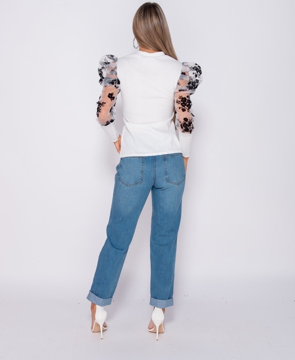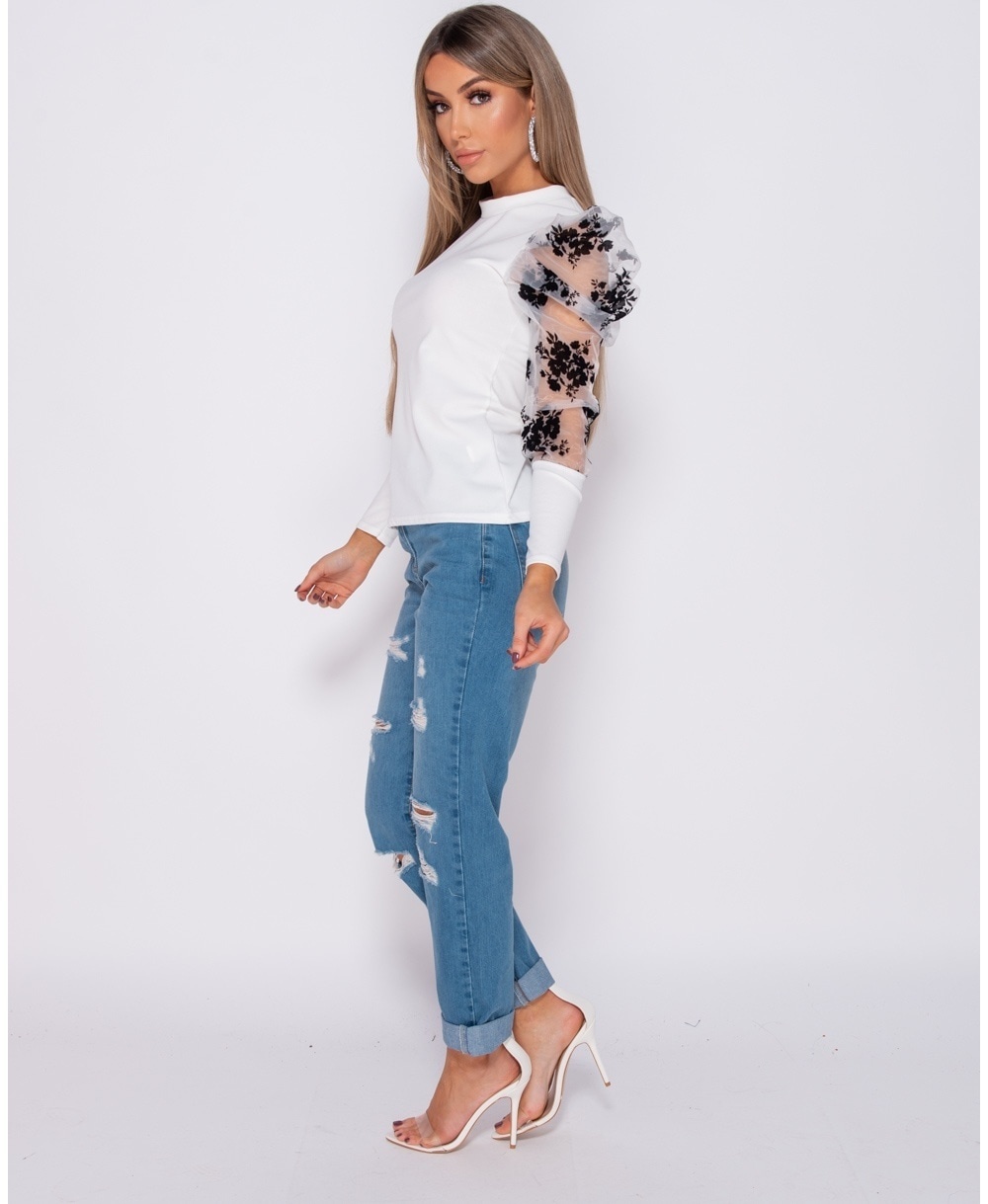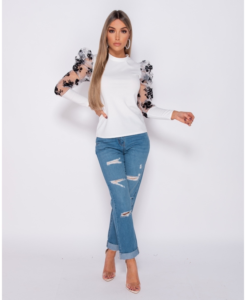 Holen Sie sich Ihre Übergangs-Kollektion mit unserem Angebot an neuen Saison Platten eingedeckt. Diese hohe Hals Spitze mit Blumenflockdruck und Puffärmeln mit zerrissenen Jeans und hochhackigen Stiefeln für einen mühelos eleganten Look gestylt werden!